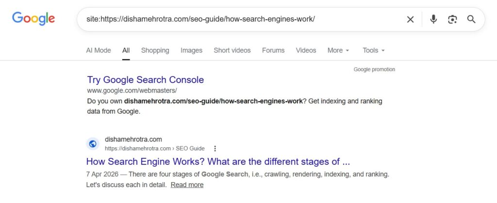 Just one thing that you must know… Not all indexed page list shows in the search result. It is best to use the Search Console for accurate details. Learn More.